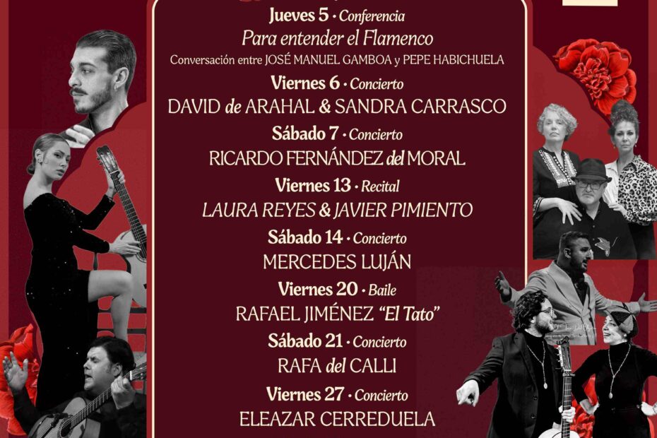 La programación incluye conciertos, recitales, baile, una charla divulgativa y una exposición, con la participación de David de Arahal & Sandra Carrasco, Ricardo Fernández del Moral, Laura Reyes & Javier Pimiento, Mercedes Luján, Rafael Jiménez “El Tato”, Rafa del Calli, Eleazar Cerreduela y José Luis Montón.